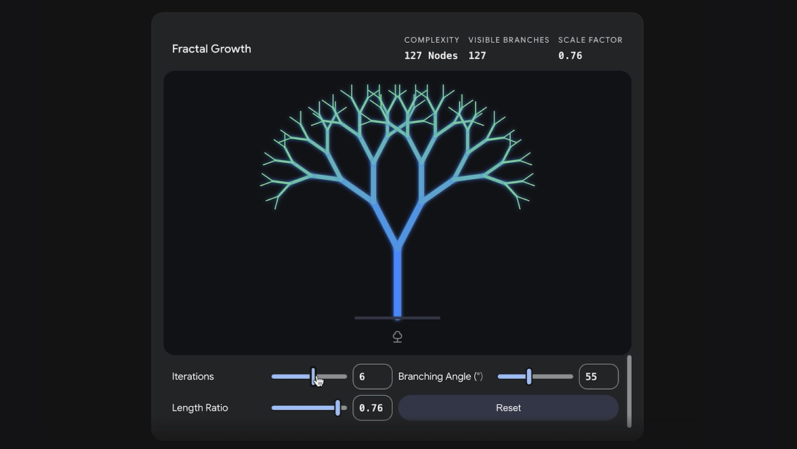 A funkció használatához érdemes a promptot úgy kezdeni, hogy „Mutasd meg” vagy „Segíts vizualizálni”, és ki kell választani a „Pro” modellt is. Például kérheted, hogy „Vizualizáld, hogyan működnek a fraktálok”, és ekkor megjelenik a növekedésük, miközben módosíthatod az olyan paramétereket, mint az elágazási szög, az arányok vagy az iterációk száma.